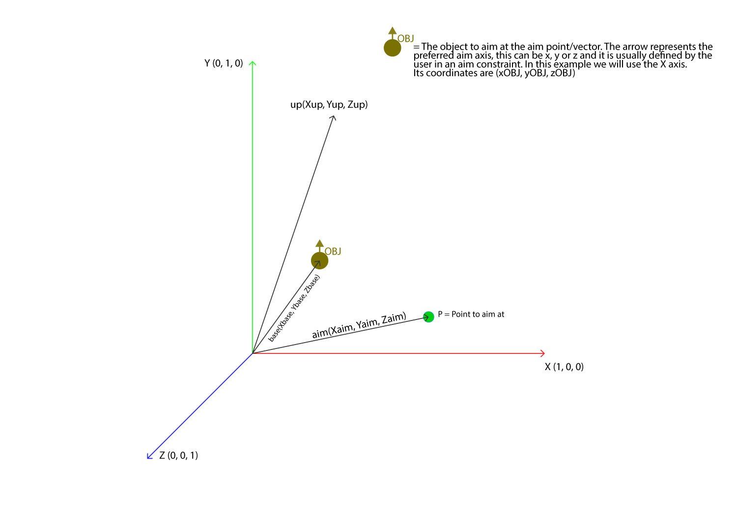 fig. 5 We now have 3 perpendicular vectors (it may be a good idea to normalize the new aim as well) and we can compose a 4 by 4 matrix. The last row represents the transform and since in an aim constraint that doesn't need to change we can set it back to the obj's base coordinates.