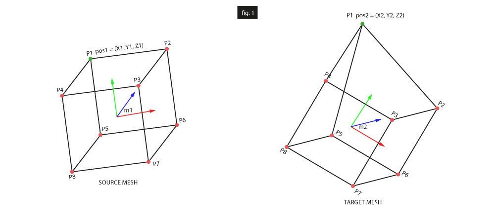 Given two geometries (SOURCE MESH, TARGET MESH), we can identify m1 and m2 as the respective transform matrices, and pos1 and pos2 as the respective positions.