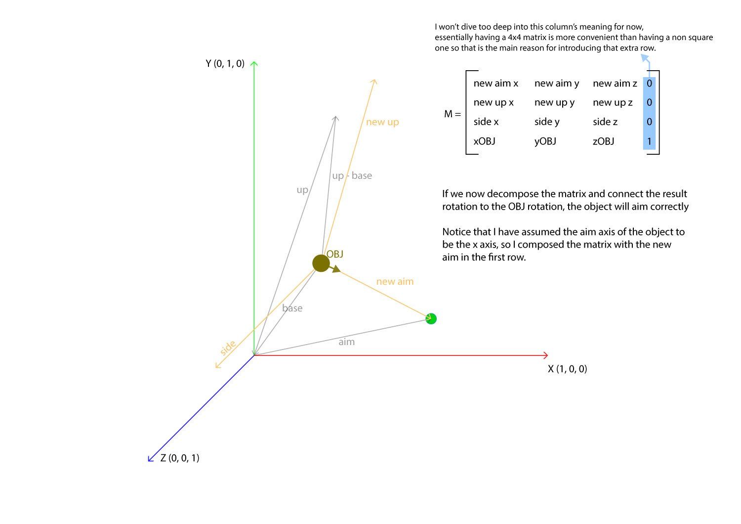 fig. 5 We now have 3 perpendicular vectors (it may be a good idea to normalize the new aim as well) and we can compose a 4 by 4 matrix. The last row represents the transform and since in an aim constraint that doesn't need to change we can set it back to the obj's base coordinates.